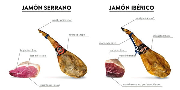 Tuy cùng là đùi heo muối chất lượng cao nhất tại Tây Ban Nha, đùi heo muối Iberico và đùi heo muối Serrano thực chất không hoàn toàn giống nhau. Nguyên nhân đến từ quy trình sản xuất khác biệt, từ đó dẫn đến hương vị đặc trưng của từng loại đùi heo.